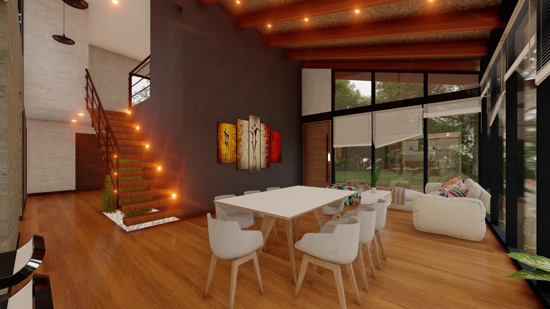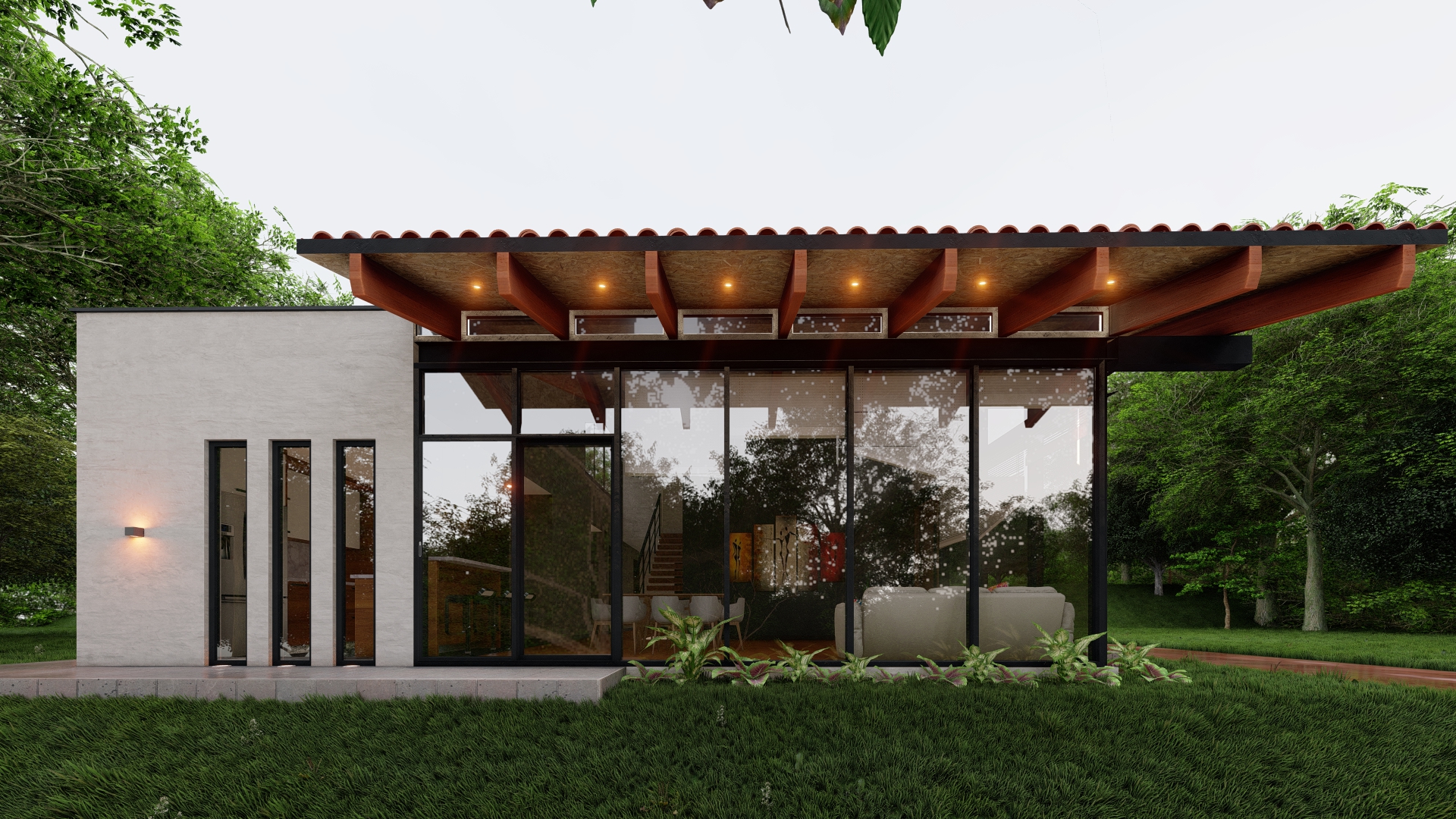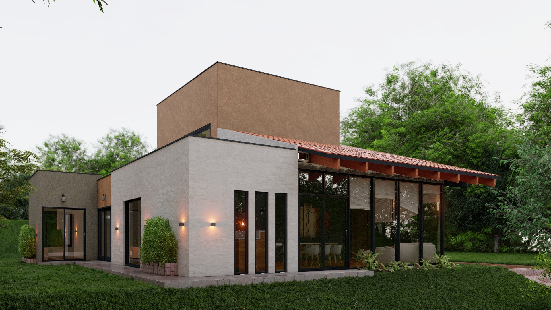 Con una superficie construida de 250 m2 en un terreno de 1000 m2, esta casa cuenta con tres dormitorios y una amplia área social en la planta baja, mientras que en la segunda planta se encuentra un espacio de estar conectado con una terraza que ofrece vistas panorámicas de los alrededores. Además, la casa cuenta con amplias áreas verdes dispuestas en tres terrazas que se integran perfectamente con su topografía.